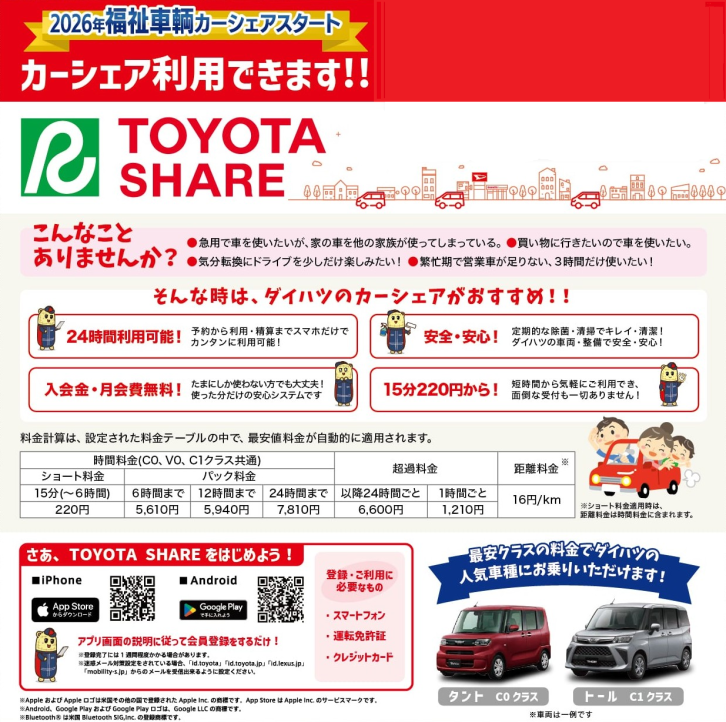それに伴い、福祉車両レンタカーをご利用いただく際の不便さ解消のために、24時間15分単位でご利用いただけるカーシェア「TOYOTA SHARE」の導入準備をしております。